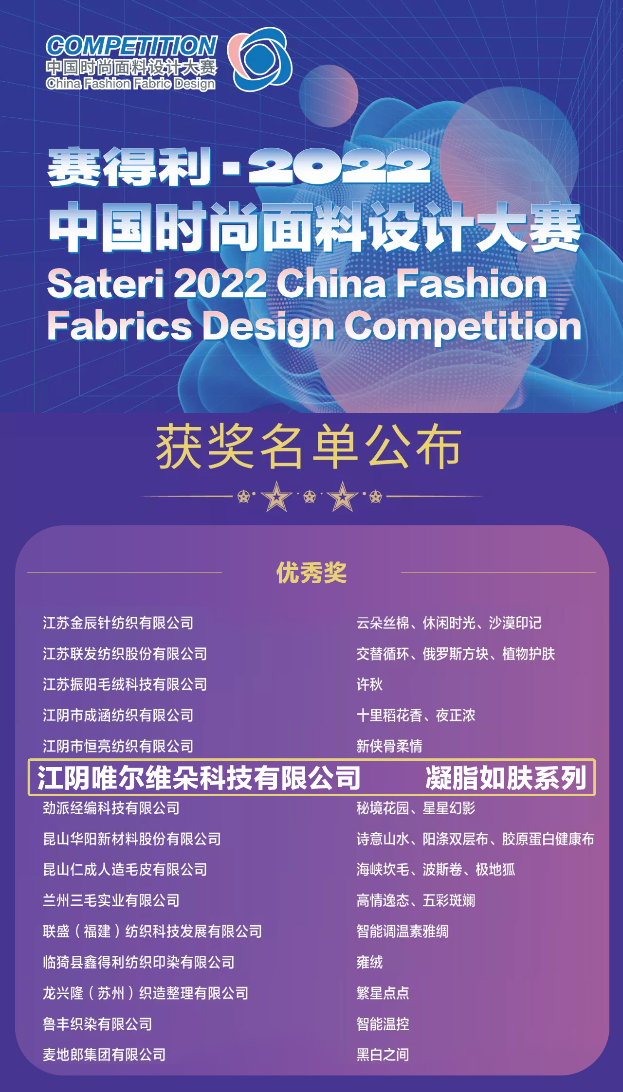我司的“凝脂如肤”产品系列165、168两款面料参加了此次大赛,经过重重选拔,最终有幸获得了产品优秀奖项。